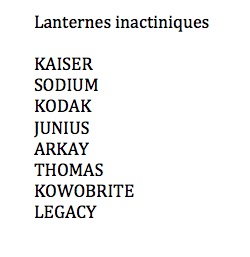 Les marques les plus connues des lanternes inactiniques sont Kodak, Kaiser, Sodium et Junius.